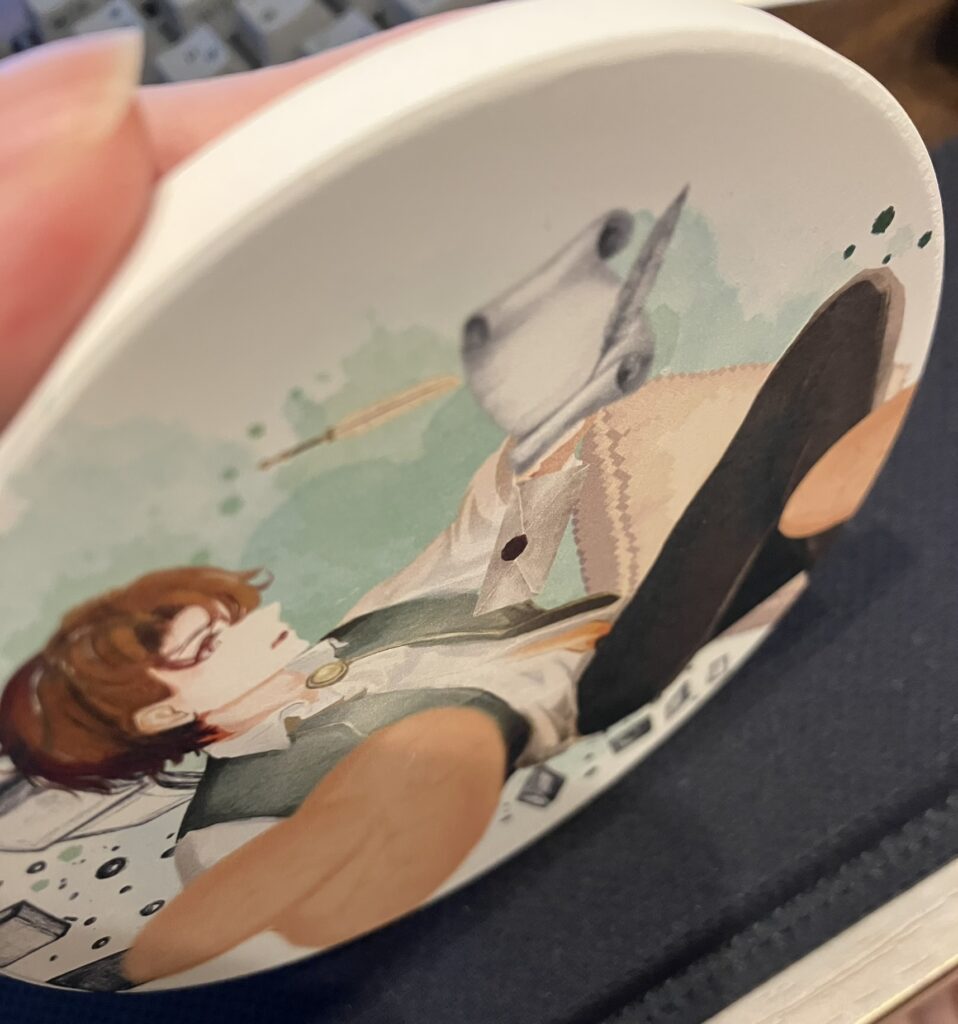 最近pixivファクトリー製のコースターを一枚試しに買いまして、イラストは自作なのですが、その塗りと白雲石のざらざら質感がベストマッチしており大変エモい。